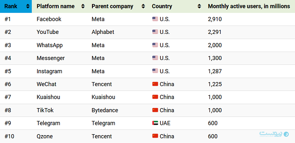 متوسط تعداد کاربران ماهانه ۱۰ رسانه اجتماعی محبوب