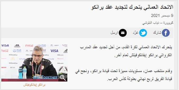 سایت «الکوره» خبر داد فدراسیون عمان از سطح خوب تیم ملی زیرنظر برانکو رضایت کامل دارد و می خواهد قرارداد این مربی کروات را برای سال آینده تمدید کند.