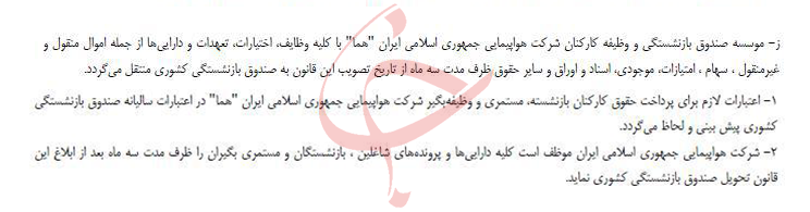 موسسه صندوق بازنشستگی و وظیفه کارکنان شرکت هواپیمایی جمهوری اسلامی ایران "هما" به صندوق بازنشستگی کشوری منتقل میشود.