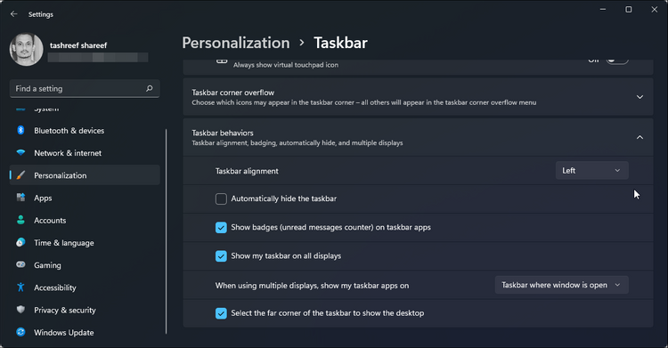 روی منو کشویی برای همترازی نوار وظیفه کلیک کرده و Left را انتخاب کنید. منو نوار وظیفه و استارت اکنون به سمت چپ منتقل میشود.
