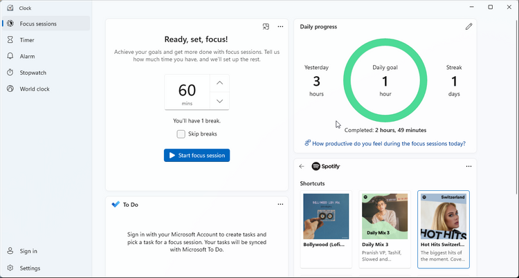 زمانی که زبانه جلسات تمرکز را باز میکنید یک تایمر تمرکز، گزارش پیشرفت روزانه و گزینههایی برای همگامسازی لیست پخش اسپاتیفای و حساب کاربری Microsoft To-Do قابل مشاهده خواهند بود.
