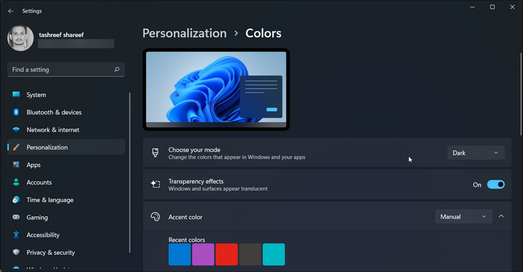 برای فعال کردن حالت تیره در ویندوز ۱۱ به آدرس Settings > System > Personalization > Colors مراجعه کنید. سپس از منو کشویی گزینه Dark را انتخاب کنید.