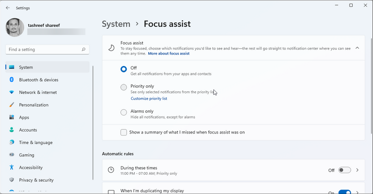 برای فعال کردن این ویژگی به آدرس Settings > System > Focus Assist مراجعه کنید. سپس، گزینه Priority only را انتخاب کنید تا اعلانها و هشدارهای منتخب را مشاهده کنید.