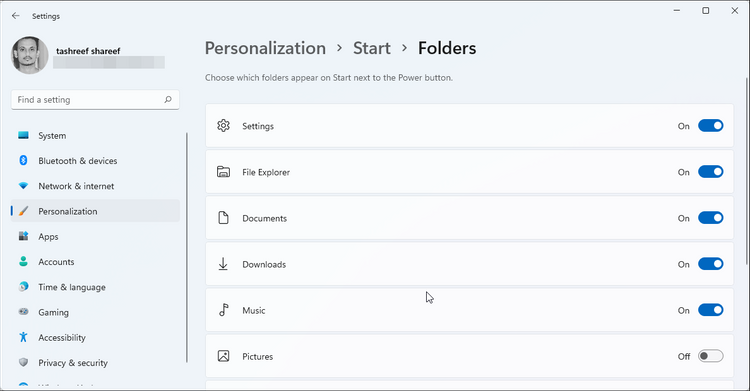 از اینجا میتوانید پوشههایی که قصد دارید در منو استارت کنار دکمه پاور نمایش داده شوند را انتخاب کنید. برای نمایش هر پوشه کلید آن را فعال کنید.
