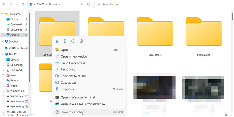 با این وجود، منو راست کلیک کلاسیک همچنان بخشی از ویندوز ۱۱ است. برای دسترسی به آن در فایل اکسپلورر راست کلیک کرده و گزینه Show more options را انتخاب کنید تا منو باز شود. همچنین میتوانید از کلیدهای Shift + F۱۰ صفحه کلید برای دسترسی به این گزینه استفاده کنید.