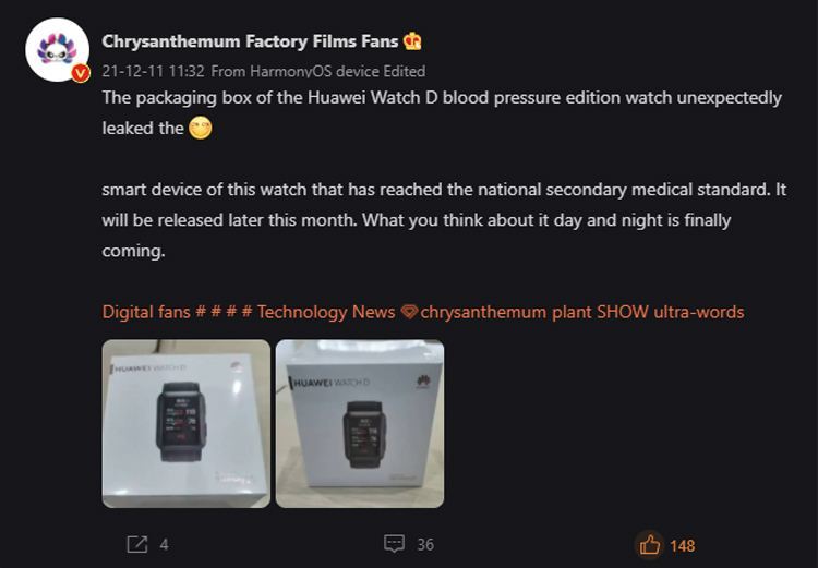 این ساعت هوشمند جدید توانایی سنجش فشارخون را داراست. وبسایت ItHome گزارش داده است که یکی از کاربران شبکه اجتماعی weibo اخیراً تصاویری از جعبه بسته بندی Huawei Watch D را در وب سایت چینی microblogging منتشر کرده است. براساس تصاویر منتشر شده، طراحی این ساعت هوشمند با نمونههای قبلی تفاوت چندانی ندارد و دارای یک صفحه نمایش مستطیل شکل با دو دکمه در کناره است.