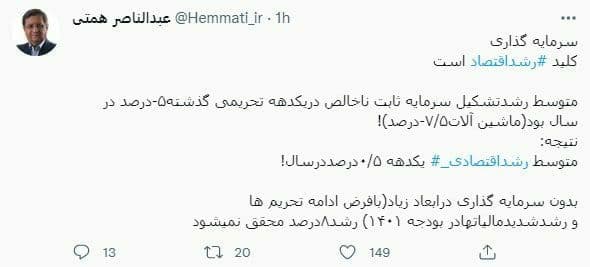 همتی: بدون سرمایه گذاری، رشد ۸ درصدی محقق نمی شود