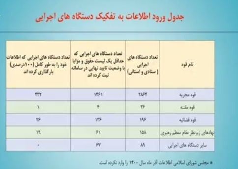 عرباسدی معاون سرمایۀ انسانی سازمان اداری و استخدامی کشور در توضیح دستگاههایی که اطلاعات حقوق و مزایای کارکنان خود را ثبت کردهاند، گفت: از میان ۲۸۶۴ دستگاه اجرایی ذیل قوۀ مجریه، ۱۴۶۱ دستگاه اطلاعاتشان را در سامانه ثبت کردهاند، ۱۳۳۰ دستگاه باقیمانده که اطلاعاتشان را وارد نکردهاند، شهرداریها هستند که اگر این اتفاق بیفتد میتوان گفت بیش از ۹۰درصد اطلاعات حقوق و مزایای قوۀ مجریه ثبت شده است.