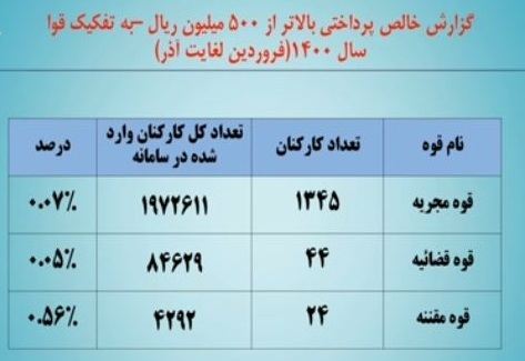 وی در ارائۀ گزارش خالص پرداختی بالاتر از ۵۰ میلیون تومان به تفکیک قوا در سال ۱۴۰۰، تصریح کرد: طبق اطلاعات ثبتشده در سامانه تا امروز، در قوۀ مجریه، ۱۳۴۵ نفر، در قوۀ قضائیه، ۴۴ نفر و در قوۀ مقننه ۲۴ نفر دریافتی بیش از ۵۰ میلیون تومان دارند.