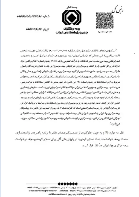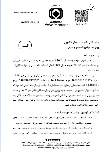در این نامه، بیمه مرکزی خواهان جایگزینی متن پیشنهادی این نهاد با متن فعلی لایحه بودجه ۱۴۰۱ شده که به شرح زیر است: