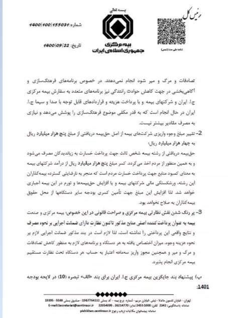 بیمه مرکزی در این نامه تغییر رقم کسر ۴۰۰ میلیارد تومان از درآمد فروش حق بیمه شخص ثالث ار شرکتهای بیمه به ۵۰۰ میلیارد تومان را سبب ورشکستگی مالی شرکتهای بیمه گر و افزایش نارضایتی آنها عنوان کرده است.