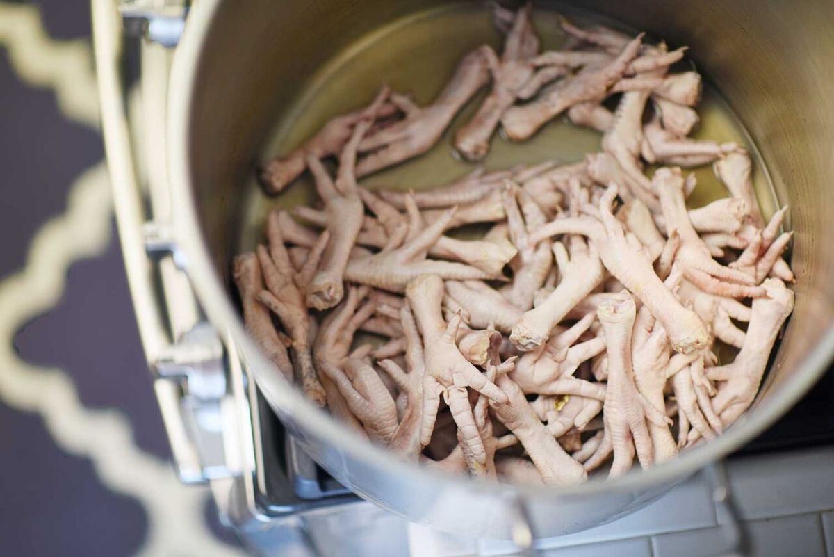 ۱. پای مرغها را شسته و در شیشه میگذاریم. (به آن آب اضافه نکنید)