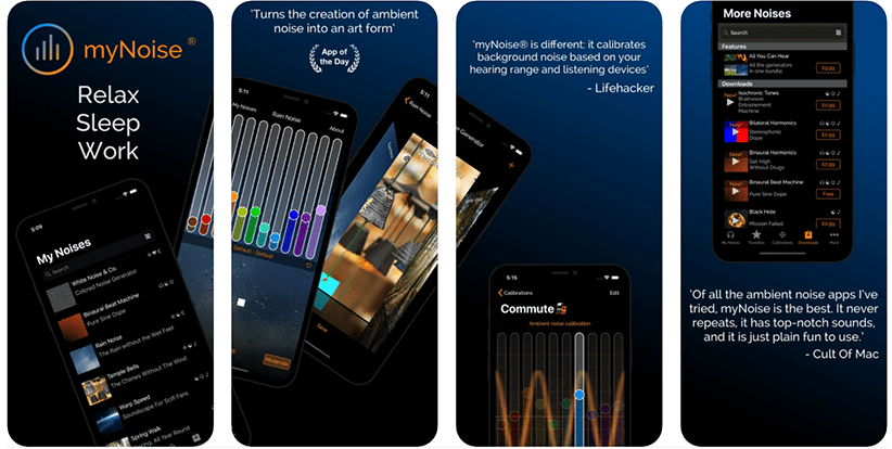 برخلاف برنامههای معمولی در گوشیهای هوشمند، myNoise طیف وسیعتری از موسیقیهای متن، به غیر از موضوعات طبیعت دارد. myNoise یک کتابخانه صوتی از زنگهای معبد و سرودهای بودایی ارائه میدهد، تا به شما کمک کند که آرام بخوابید.