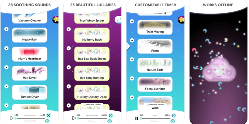 این اپلیکیشن بیش از ۱۰ موسیقی متن دارد که به محض اینکه کودک شما بخوابد، به طور خودکار وارد حالت سکوت میشود. White Noise Baby دارای ویژگی تشخیص صدا هم هست، که اگر کودک نیمه شب با گریه از خواب بیدار شود به طور خودکار صداها را پخش میکند. با استفاده از این برنامه، والدین هم میتوانند راحتتر بخوابند و کمتر در طول شب نگران فرزند کوچک خود باشند.
