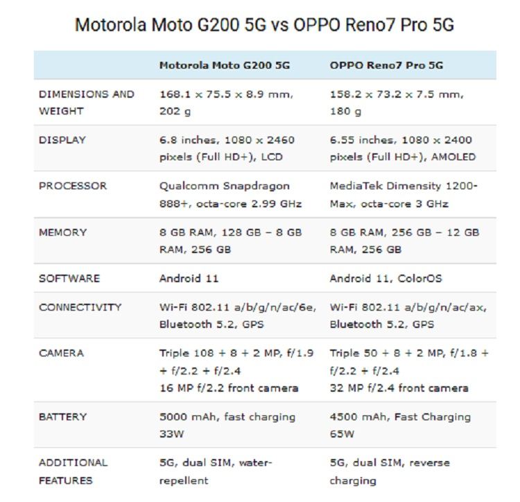 برخلاف سری قبلی گوشیهای OPPO، سری OPPO Reno۷ هیچ پرچمدار سطح بالایی ندارد. OPPO Reno۷ Pro ۵G قدرتمندترین نسخه این سری بوده که به جای یک پرچمدار برتر بیشتر به یک قاتل پرچمدار نزدیک است. گوشیهای قاتل پرچمدار معمولاً مناسب کسانی میباشد که به دنبال یک گوشی با قدرت پردازشی بالا، اما کم هزینه هستند. یکی از جالبترین قاتلهای پرچمدار منتشر شده در دوره گذشته، Motorola Moto G۲۰۰ ۵G میباشد. در جدول زیر به مقایسه مشخصات این دو محصول پرداختیم: