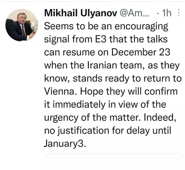 به گزارش سایت طلا، «میخائیل اولیانوف» نماینده دائم روسیه در سازمانهای بین المللی در وین امروز شنبه در پیامی توییتری نوشت: به نظر می رسد نشانه دلگرم کننده ای از سوی تروئیکای اروپایی وجود دارد مبنی بر اینکه مذاکرات حسب آمادگی ایرانی ها، میتواند از ۲۳ دسامبر (۵ روز دیگر) ازسرگرفته شود.