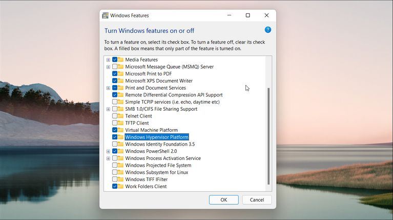 در پنجره Windows Features، گزینه Virtual Machine Platform و Windows Hypervisor Platform را انتخاب کنید.