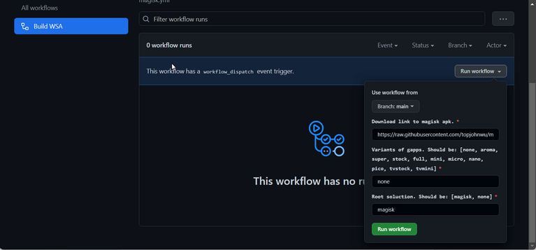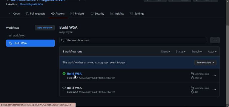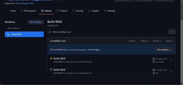 در تب Actions، روی گزینه Build WSA یا Magisk زیر بخش All workflow کلیک کنید.