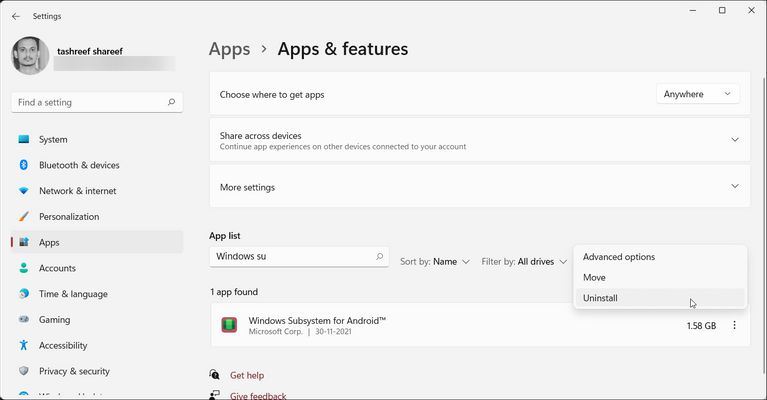اگر زیرسیستم ویندوز برای اندروید را روی سیستمتان نصب کرده باشید، میتوانید آن را از طریق بخش Apps & Features حذف کنید. برای حذف WSA مراحل زیر را دنبال کنید: