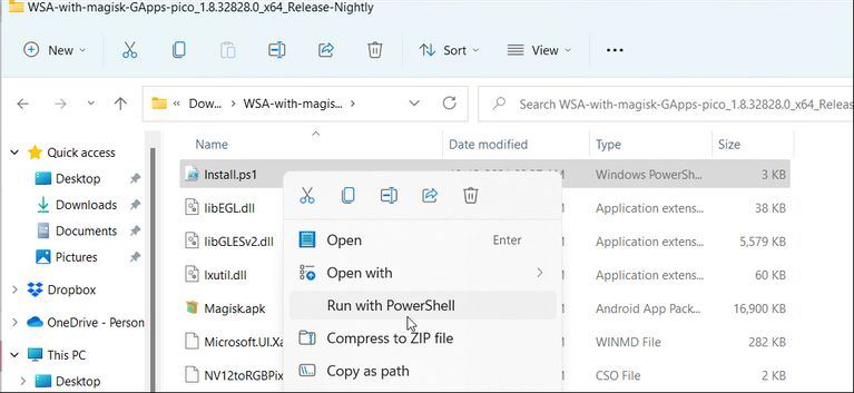 روی فولدر دانلود شده (WSA-with-magisk-GApps-pico_1.8.32828.0_x64_Release-Nightly) راست کلیک کرده و سپس گزینه Extract را انتخاب کنید. فولدر مدنظرتان را انتخاب کرده و محتوای فولدر دانلودی را خارج کنید.