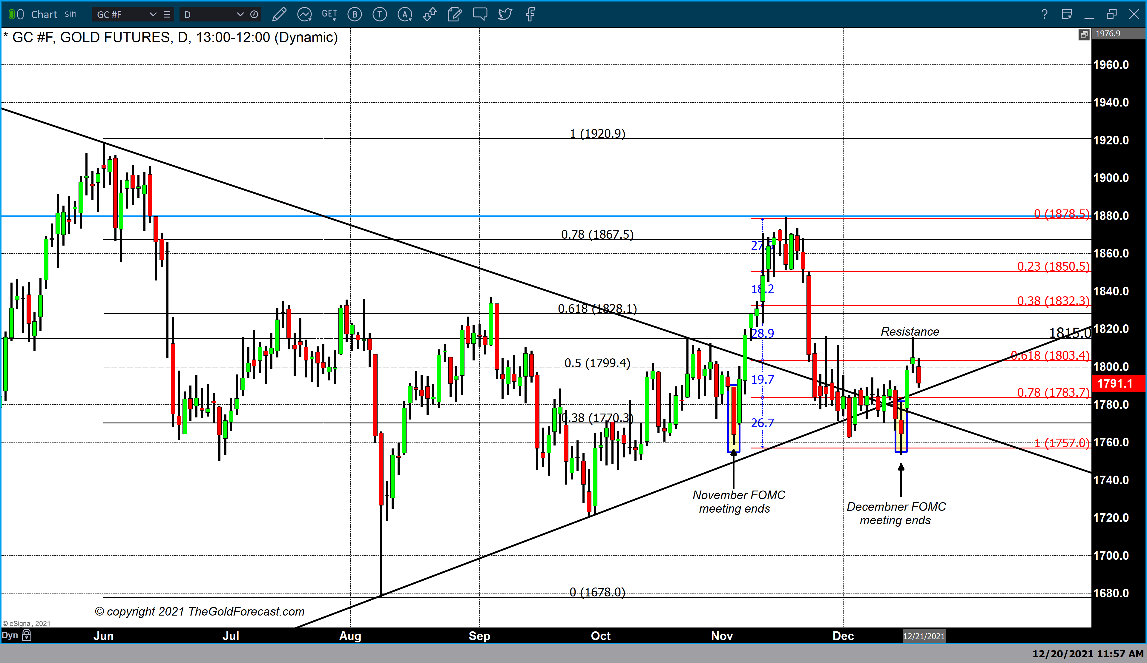 مطالعات فنی حاکی از آن است که طلا در نقطه 1815 دلار دارای مقاومت بسیار شدیدی است. این نقطه بالاترین قیمت طلا در هفته گذشته به شمار می رود که پس از برخورد به آن طلا وارد روند اصلاحی شده و تا زیر 1800 دلار کاهش یافت.