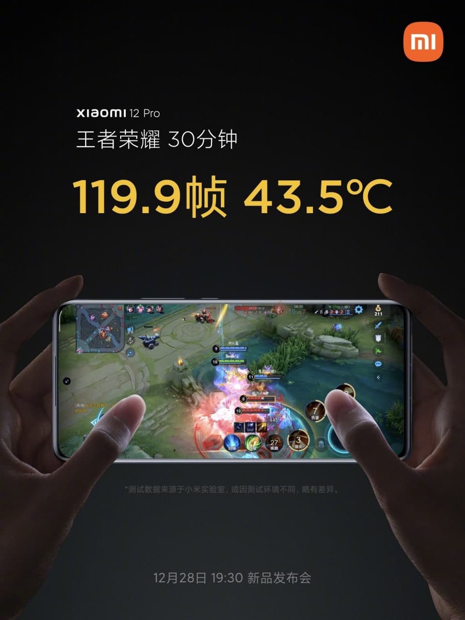 غول فناوری چین با انتشار این پوستر ادعا میکند که شیائومی ۱۲ پرو آینده پس از حدود نیم ساعت بازی King of Glory موفق به ثبت دمای ثابت ۴۳.۵ درجه شده است که آمار قابل توجهی محسوب میشود.