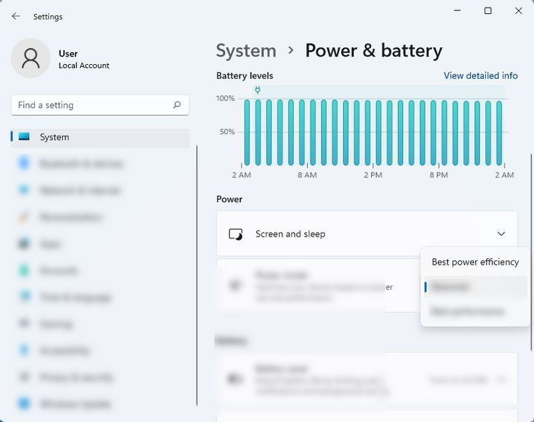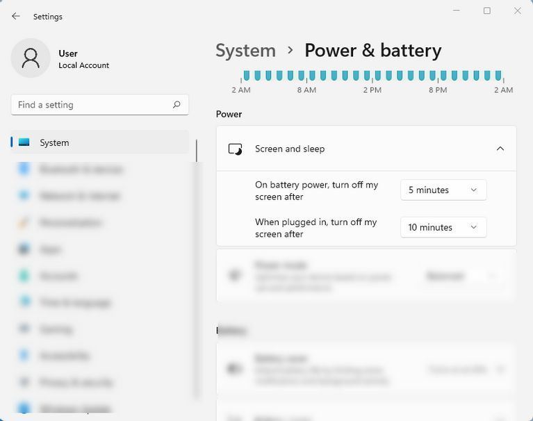 به مسیر System > Power & battery رفته و سپس زیر بخش Screen and sleep، مدت زمان مدنظرتان برای ورود سیستم به حالت Sleep را انتخاب کنید. این کار را برای زمانی که لپ تاپ به شارژر وصل است هم می‌توانید انجام دهید.