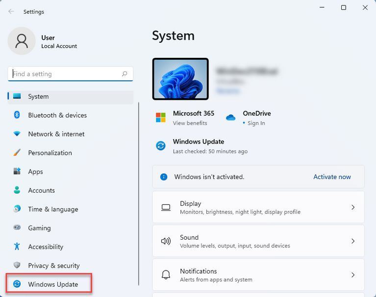 در صفحه سمت چپ تنظیمات، روی گزینه Windows update کلیک کنید.