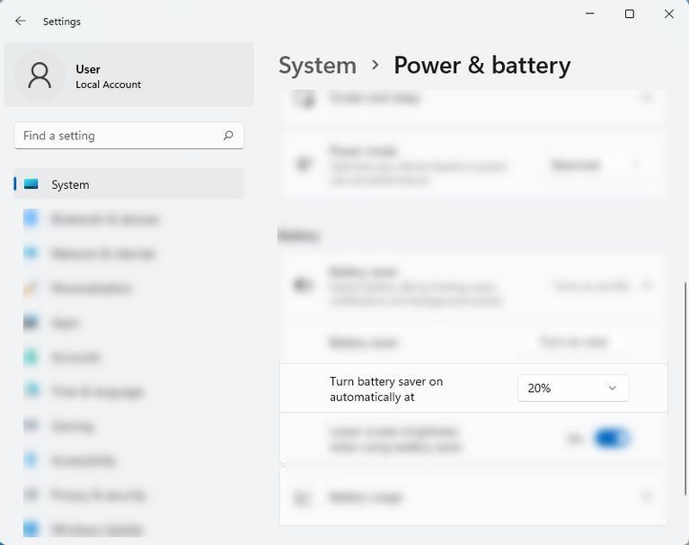 ویندوز ۱۱ هم مانند ۱۰ از حالت صرفه‌جویی در باتری یا Battery Saver بهره می‌برد که با تنظیم خودکار روشنایی نمایشگر و همچنین ایجاد محدودیت برای نوتیفیکیشن‌ها و فعالیت‌های پس زمینه، اجازه می‌دهد شارژدهی بیشتری را تجربه کنید. شما می‌توانید تنظیمات سیستم‌تان را طوری تغییر دهید که در زمان رسیدن شارژ باتری لپ‌تاپ‌تان به حد مشخصی، حالت صرفه‌جویی به صورت خودکار فعال شود.