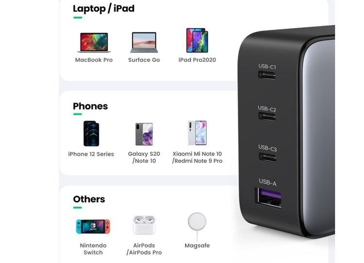 شارژر یوگرین بدلیل استفاده از فناوری Navitas GaNFast سرعت شارژ را تا ۳ برابر سریعتر از شارژرهای مبتنی بر سیلیکون افزایش میدهد امکان شارژ هر دستگاهی را دارد.
