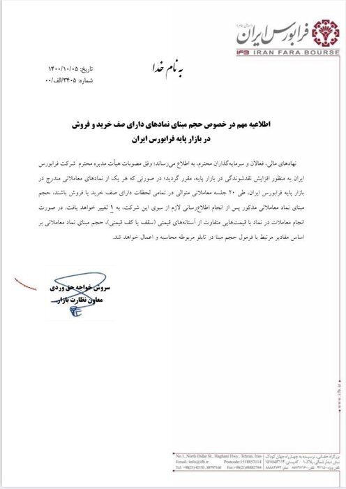 به گزارش سایت طلا،شرکت فرابورس ایران در اطلاعیهای مهم اعلام کرد: براساس مصوبات هیات مدیره شرکت فرابورس ایران به منظور افزایش نقدشوندگی در بازار پایه مقرر شد، در صورتی که هر یک از نمادهای معاملاتی مندرج در بازار پایه فرابورس ایران در ٢٠ جلسه معاملاتی متوالی در همه لحظات دارای صف خرید یا فروش باشد؛ حجم مبنای نماد معاملاتی مذکور پس از انجام اطلاع رسانی لازم از سوی این شرکت به «یک» تغییر کند.