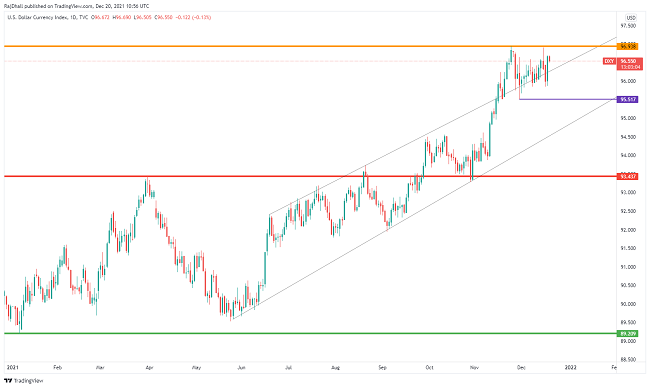 سال 2021 برای دلار آمریکا سال فوق العاده بود و اگر دلار همین روند را ادامه دهد باید در انظار افزایش هرچه بیشتر ارزش آن باشیم. شاخص دلار طی ماه های گذشته توانست مقاومت بالای کانال خود را شکسته و از آنجا نیز یک حرکت صعودی جدید را در پیش بگیرد.