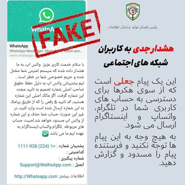 به گزارش سایت طلا ، سرهنگ علی محمد رجبی رئیس مرکز اطلاع رسانی ناجا ، اظهار کرد: این یک پیام جعلی است که از سوی هکرها برای دسترسی به حسابهای کاربری در تلگرام، واتساپ و اینستاگرام ارسال میشود.