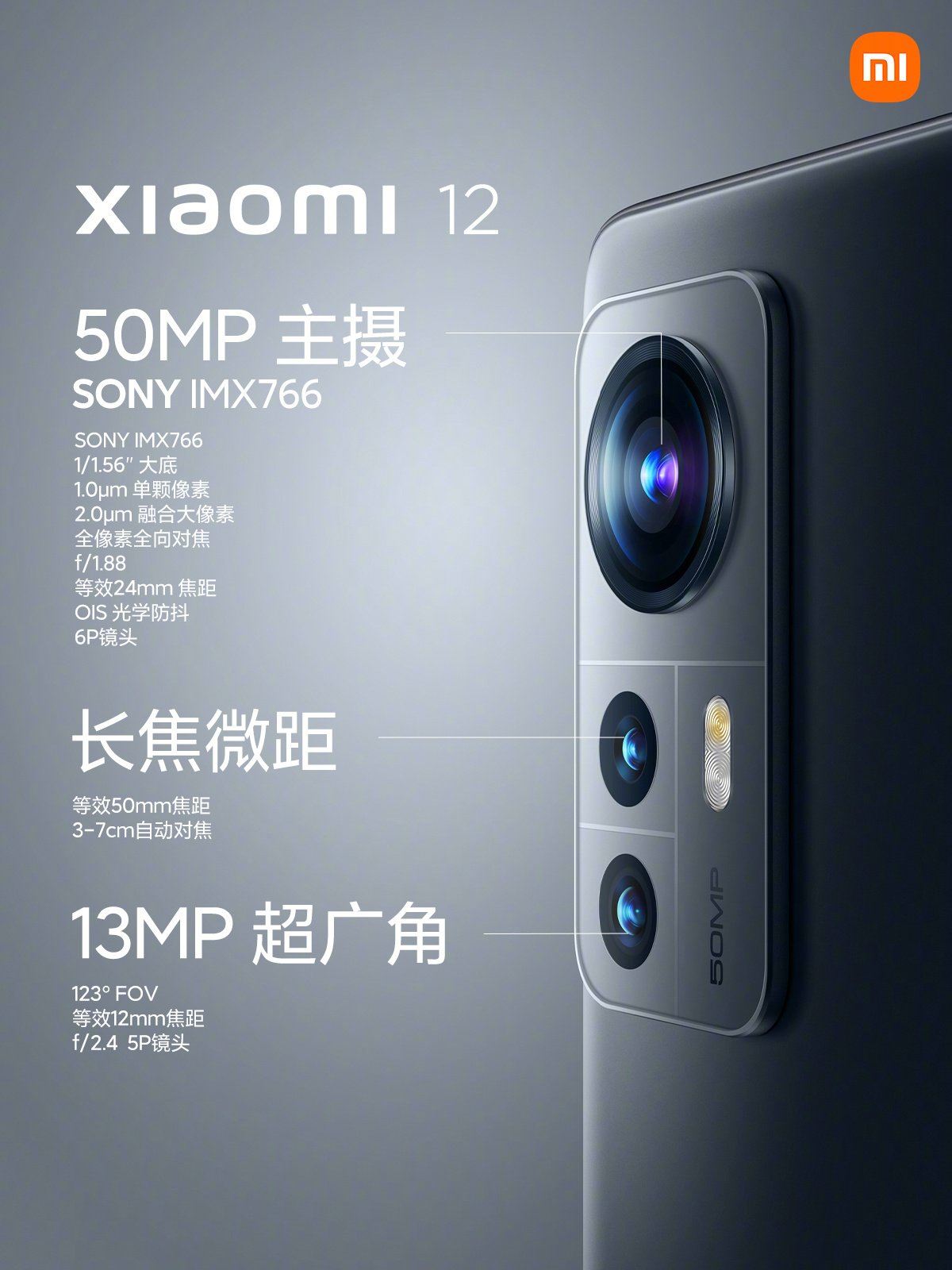 دوربین سلفی این دستگاه هم ۳۲ مگاپیکسلی است. کاربران با دوربین اصلی این پرچمدار می‌توانند ویدیوهای 8K ضبط کنند. شیائومی ۱۲ وزنی برابر ۱۸۰ گرم دارد و از کارت حافظه پشتیبانی نمی‌کند.