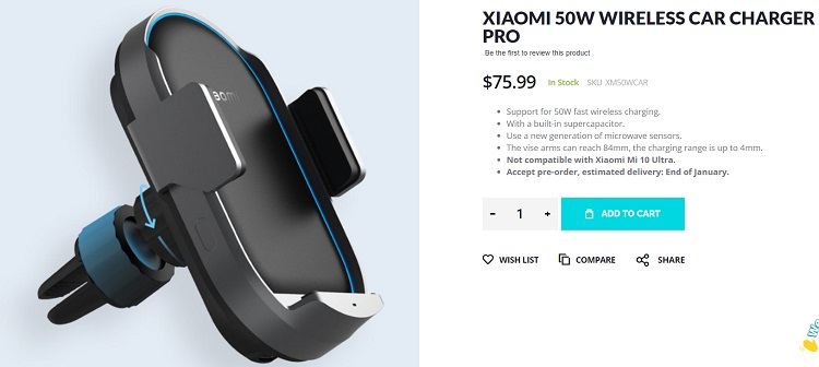 این شارژر، شارژ بی سیم Mi 10 Ultra را پشتیبانی نمیکند. امکان قرار دادن گوشی با یک قاب حداکثر ۴ میلی متری نیز در این شارژر وجود دارد. شارژر بیسیم خودرو شیائومی ۵۰ واتی دارای یک ابرخازن داخلی و یک کانال هوای مستقیم میباشد که سبب خنک کردن گوشی شده و در نتیجه سبب بهبود کارایی و کاهش زمان شارژ خواهد شد. این شارژر بی سیم، اکنون با قیمت پیش فروش ۷۵.۹۹ دلار در سایت Giztop موجود است. ارائه این محصول در اواخر ژانویه ۲۰۲۲ آغاز خواهد شد.