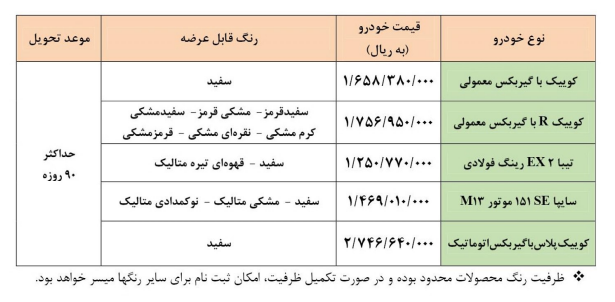 بر این اساس حداکثر زمان تحویل محصولات فروش فوقالعاده محصولات سایپا، ۹۰ روز است.