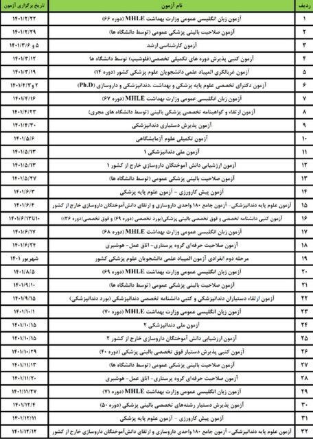 همچنین آزمون علوم پایه دندانپزشکی -آزمون جامع ۱۸۰ واحدی داروسازی و ارتقای دانش آموختگان داورسازی خارج از کشور نیز به عنوان آخرین آزمون سال ۱۴۰۱ در تاریخ ۱۲ اسفند برگزار خواهد شد.
