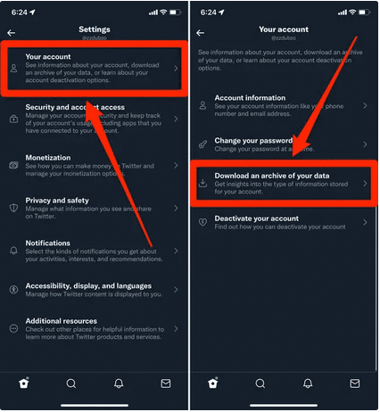 براساس گزارشها کاربران توئیتر برای دانلود توئیتهای خود از موبایل یا رایانه ابتدا باید بر روی گزینه تنظیمات کلیک کرده سپس به بخش حساب کاربری خود بروید.