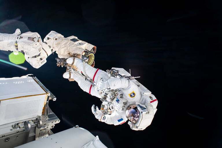 در این تصویر فضانورد فرانسوی توماس پسکت دیده میشود که در کنار ربات Canadarm۲ قرار دارد. این فضانورد در حین راهپیمایی فضایی برای نصب سپرهای خورشیدی جدید در ایستگاه فضایی بین المللی و در حال کار برای ارتقای منبع تغذیه تاسیسات دیده میشود.