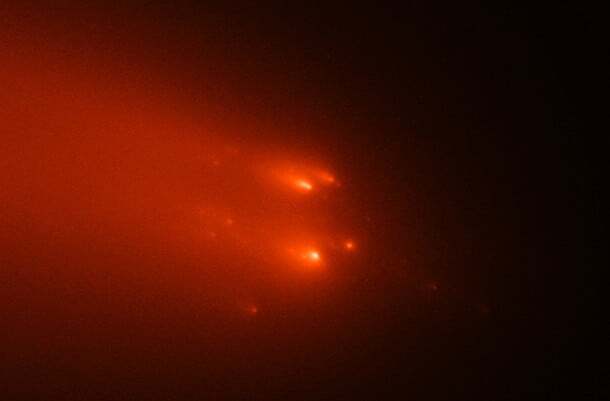 این تصویر توسط هابل (به طور مصنوعی توسط ستاره شناسان رنگ آمیزی شده تا جزئیات را برای تجزیه و تحلیل افزایش دهد) ثبت شده و هسته جامد دنباله دار اطلس را نشان میدهد، با تجزیه و تحلیل این تصویر و یک تصویر مشابه دیگر، ۳۰ قطعه جداگانه شناسایی شدند. زمانی که هابل این تصویر را ثبت کرد، این دنباله دار تقریباً ۹۱ میلیون مایل از زمین فاصله داشت. ستاره شناسان بر این باورند که ممکن است ستاره دنباله دار بزرگتری وجود داشته باشد که ۵ هزار سال پیش از کنار خورشید عبور کرده است.
