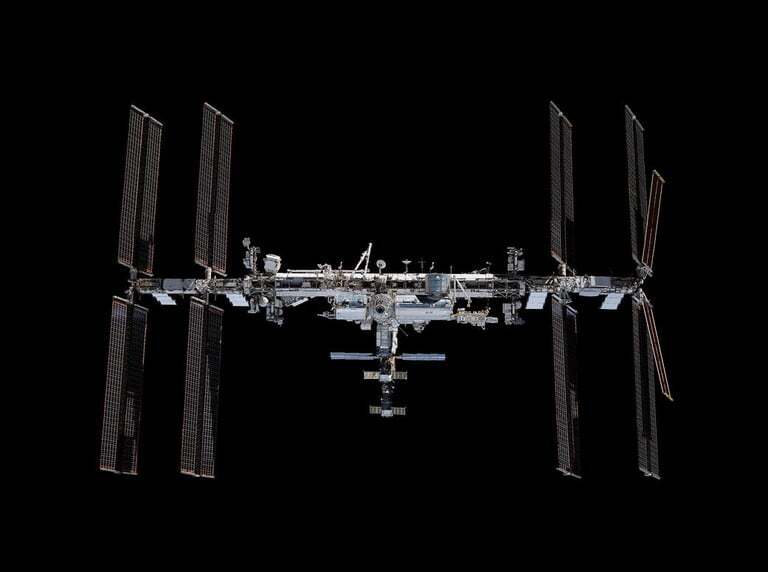 تصویر ایستگاه فضایی بین المللی توسط فضانوردی از فضاپیمای Crew Dragon اسپیس ایکس گرفته شده است. در تصویر، ایستگاه فضایی بین المللی در برابر سیاهی فضا به طور مشخصی متمایز شده است.