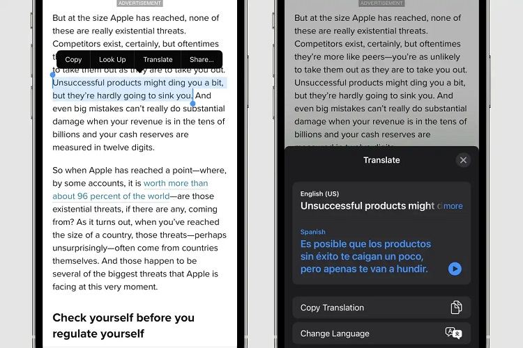 اپلیکیشن Translate در iOS 14، امکان ترجمه به ۱۱ زبان را دارد. این ویژگی با معرفی iOS 15 بهبود یافته است. در صورتی که نمیخواهید از اپلیکیشن Translate جداگانهای استفاده کنید، میتوانید روی متن مورد نظر خود نگه داشته تا برجسته شود. سپس ابزار ویرایشی را مشاهده خواهید کرد.