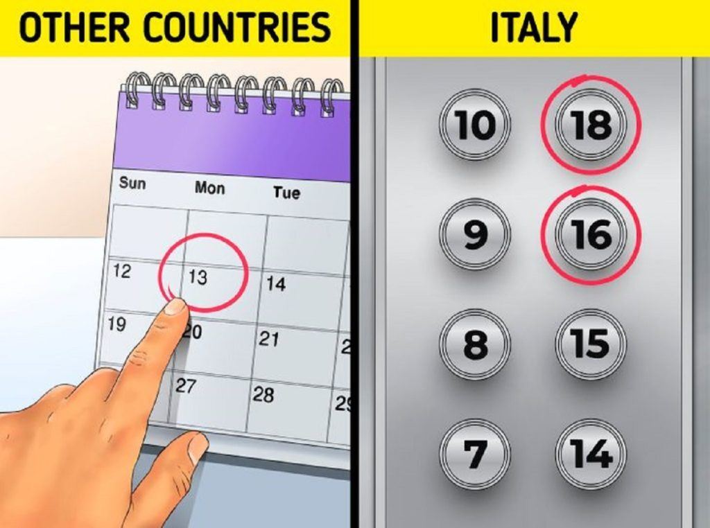در حالی که در بسیاری از کشورها عدد ۱۳ عدد بدیمنی محسوب می شود، برای ایتالیایی ها عدد ۱۷ چنین حکمی دارد. این موضوع بدین خاطر است که با پس و پیش کردن عدد رومی معادل ۱۷ یعنی XVII می شود کلمه ی VIXI را به وجود آورد که در لاتین یعنی «زندگی ام به پایان رسید.» به همین خاطر برخی از هتل ها طبقه ۱۷اُم ندارند.