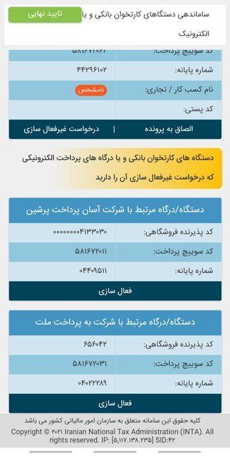 از آنجا که تمامی دستگاههای کارتخوان بانکی و یا درگاههای پرداخت الکترونیکی که متناظر با پرونده مالیاتی نباشند، غیرفعال میشوند، ضرورت دارد تا مودیان با ورود به درگاه ملی خدمات الکترونیک سازمان امور مالیاتی کشور به نشانی فوق، بخش پایانههای فروش، اطلاعات مذکور را مشاهده کرده و نسبت به الصاق دستگاههای کارتخوان بانکی و یا درگاههای پرداخت الکترونیکی خود به پروندههای موجود یا ایجاد پرونده جدید و یا درخواست غیر فعال سازی دستگاههای مطروحه اقدام کنند.
