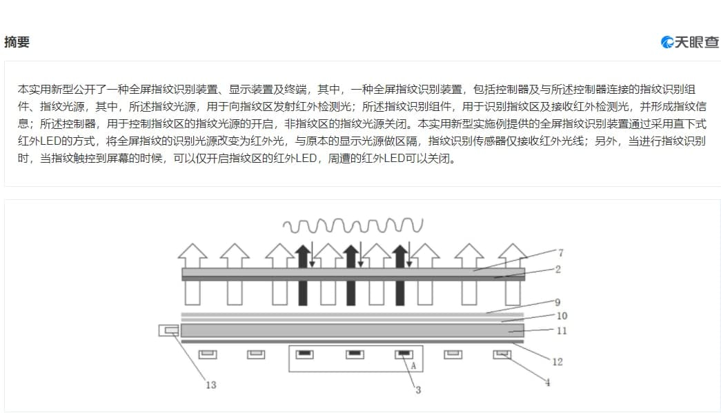 غول فناوری چین، در پتنت خود نحوه عملکرد این فناوری را به نمایش میگذارد که در آن بین دو لایه صفحه نمایش لمسی خازنی و نمایشگر معمولی AMOLED دستگاه، آرایهای از فرستندههای نور LED به کار گرفته شده است. آرایه گیرندههای نور مادون قرمز در بالای فرستندههای نور LED مادون قرمز قرار خواهند گرفت که اجزا اصلی سنسور اثر انگشت تمام صفحه هستند.