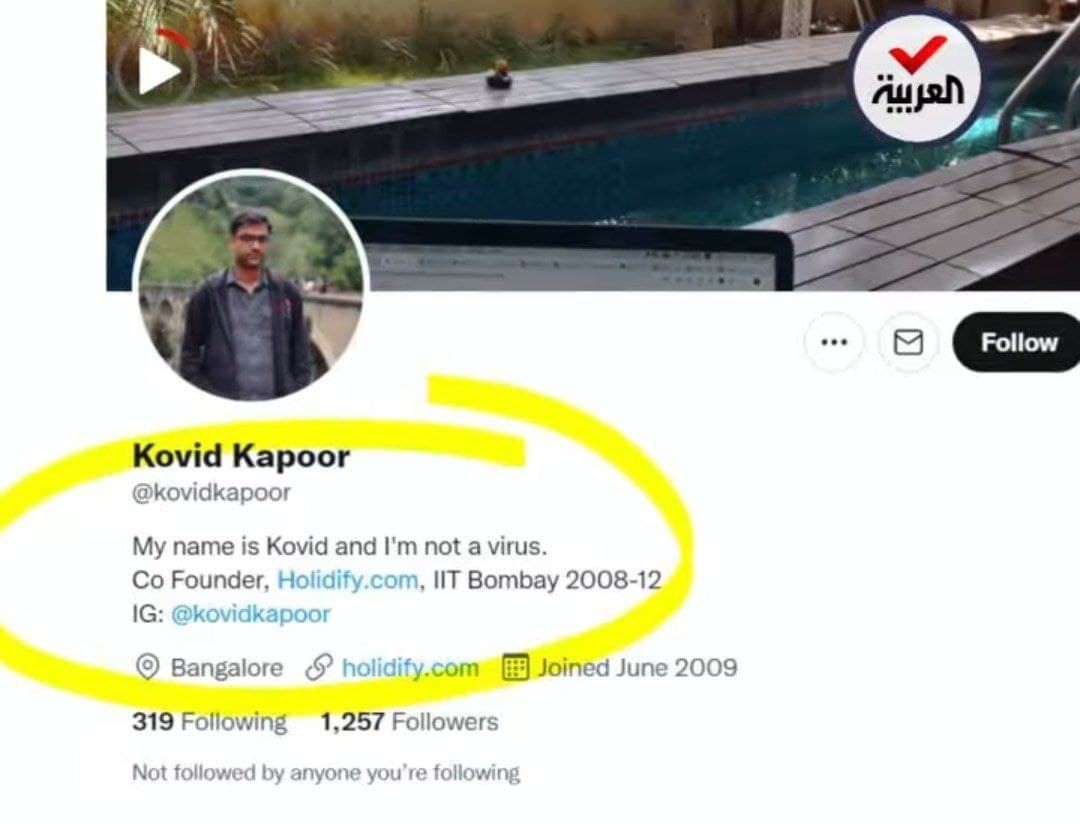 به گزارش Deccan Herald؛ کاپور، یکی از بنیانگذاران یک وب سایت مسافرتی به نام Holidify، در این شرایط به یکی از نام های شناخته شده فضای مجازی تبدیل شده است. او در بیوگرافی توییتر خود نوشت: «اسم من کووید است و من یک ویروس نیستم». نمایه توییتر کاپور اکنون مملو از موارد مختلفی است که در آن افراد یا نام او را به معنای کووید-19 اشتباه گرفته اند یا آن را مسخره کرده اند.