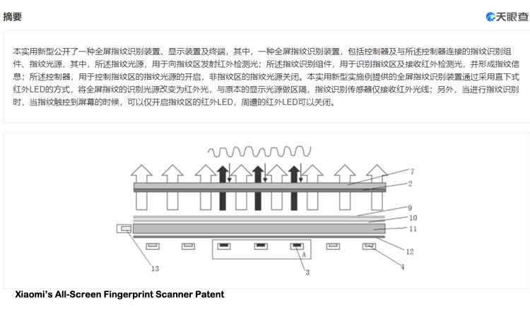 در این سند ثبت اختراع، شرکت شیائومی نحوه عملکرد این فناوری را به نمایش گذاشته است. این فناوری در حقیقت دارای مجموعهای از فرستندههای نور LED مادون قرمز در زیر لایه صفحه نمایش لمسی خازنی و بالای صفحه نمایش معمولی AMOLED است. مجموعه گیرندههای نور مادون قرمز در بالای فرستندههای نور LED مادون قرمز قرار خواهند گرفت. همه فرستندهها و گیرندههای نور LED مادون قرمز که در بالا ذکر شد، تجهیزات اصلی برای اسکنر اثر انگشت تمام صفحه هستند.