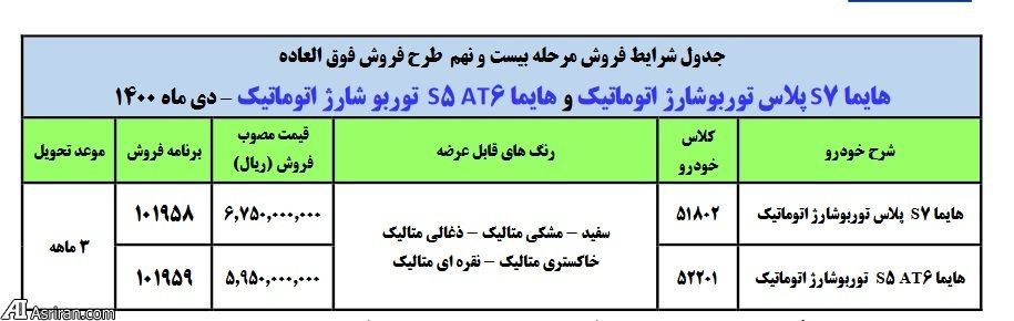 به گزارش سایت طلا، آن گونه که ایران خودرو اعلام کرده است در این طرح دو محصول هایما S5 مجهز به گیربکس 6AT و هایما S7 پلاس توربوشارژ اتوماتیک با موعد تحویل سه ماهه عرضه می شود.