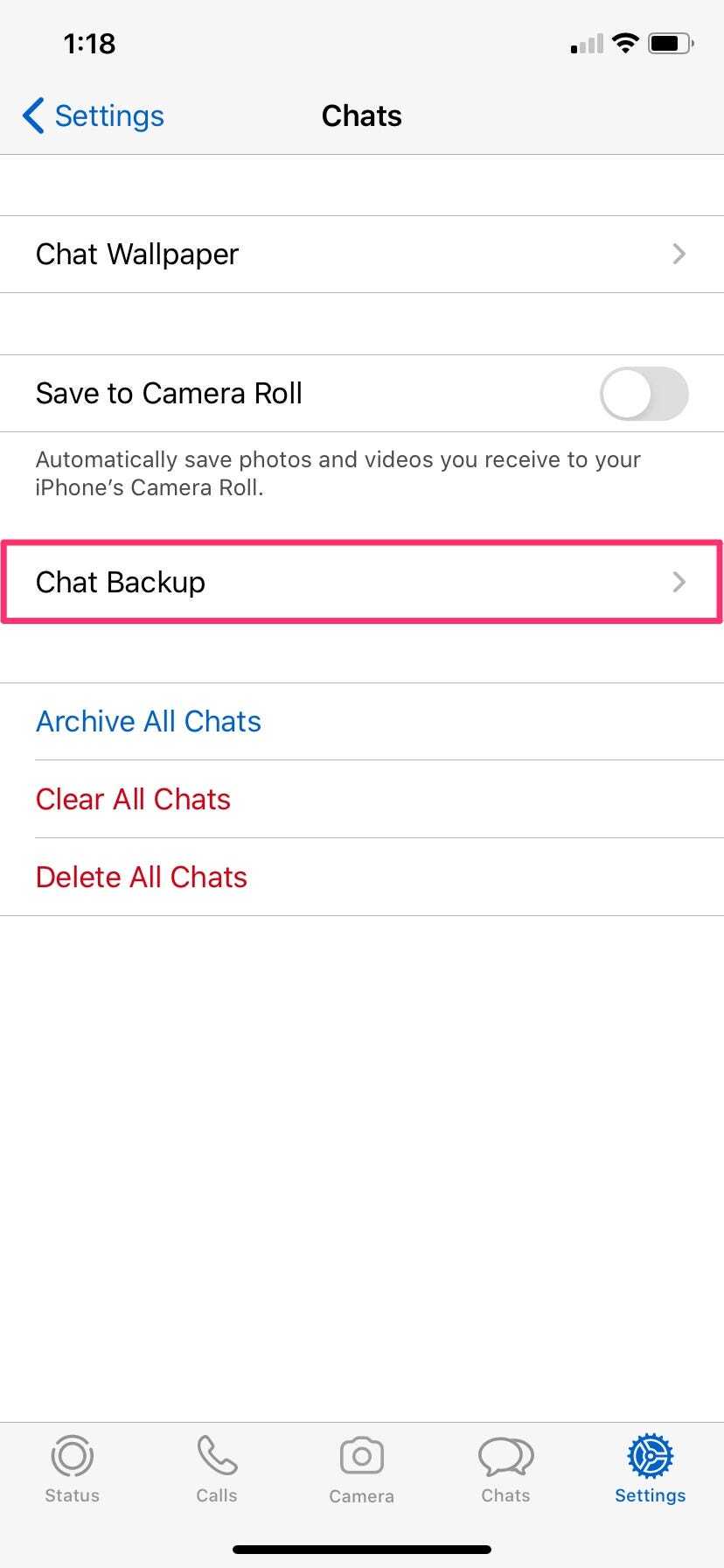 طبیعی است که در iOS شاهد جایگزین شدن گوگل درایو توسط آیکلاد باشیم. کاربران میتوانند برای ذخیرهسازی نسخه پشتیبان از تاریخچه چتهای خود پس از ورود به برنامه، ابتدا به قسمت تنظیمات (Settings) مراجعه کرده و سپس با انتخاب گزینه Chats وارد صفحه Chat Backup شوند. اکنون برای تهیه دستی نسخه پشتیبان باید گزینه Back Up Now را لمس کنید. اگر امکان تهیه خودکار نسخه پشتیبان را فعال کرده باشید، نیازی به انجام دستی این کار نخواهید داشت.