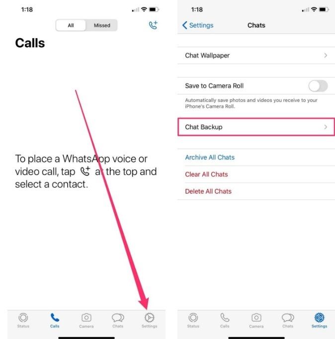 ابتدا با مراجعه به قسمت تنظیمات واتس اپ و رفتن به صفحه Chats گزینه Chat Backup را لمس کنید تا از وجود نسخه پشتیبان روی آیکلاد مطمئن شوید. اگر توانستید آخرین تاریخ ایجاد فایل بکاپ را مشاهده کنید، میتوانید با حذف و نصب دوباره اپلیکیشن، آن را اعمال نمایید.
